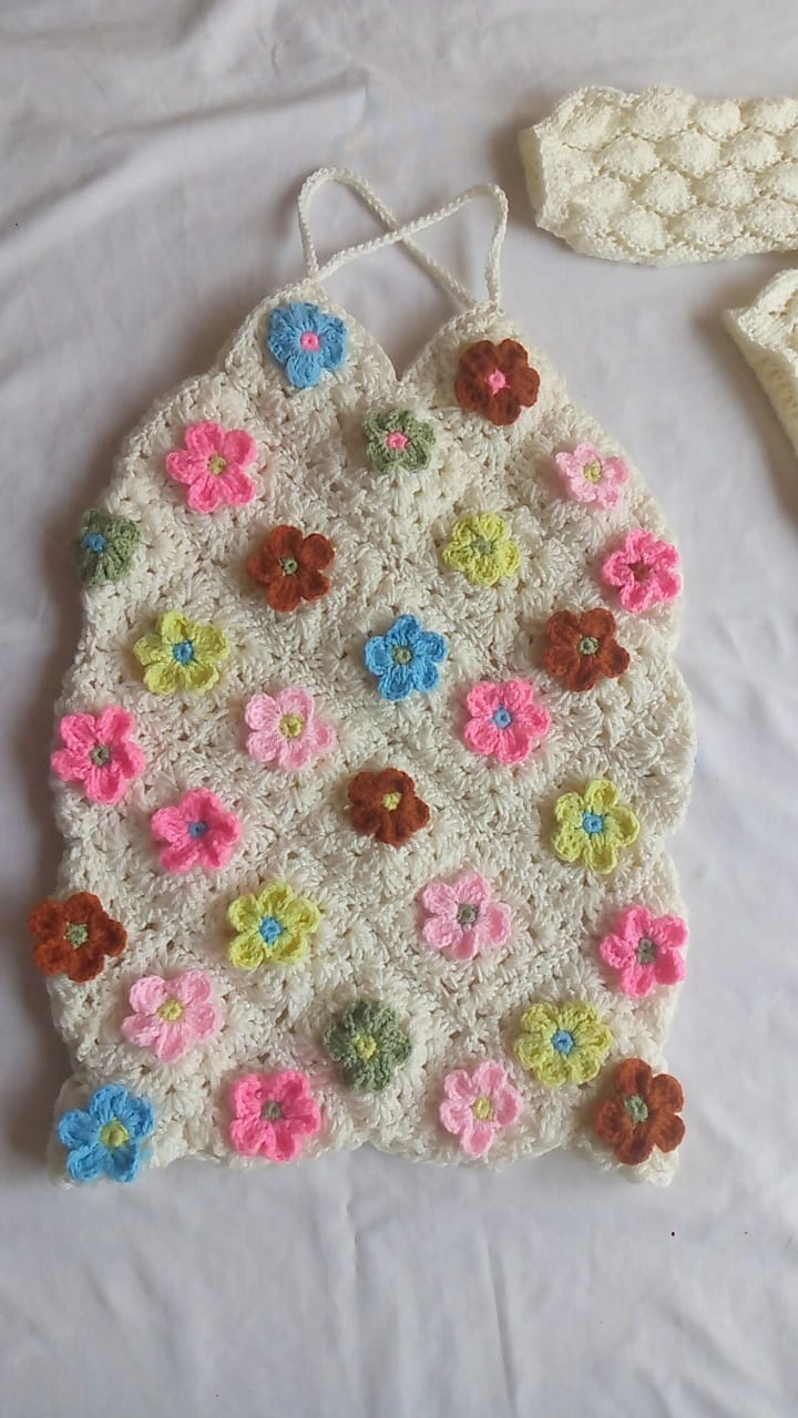 "Our beautifully designed kids' set features a finely knitted cardigan paired with a crocheted floral top, crafted to perfection. The cardigan offers a soft, cosy feel, ensuring warmth and comfort for your child, while the top is delicately crocheted, adding a charming, handmade touch to the ensemble. Both pieces are thoughtfully made with attention to detail, combining style and comfort. Ideal for layering during cooler days, this floral top and cardigan set brings together a delightful mix of elegance and warmth, perfect for your little one’s wardrobe."