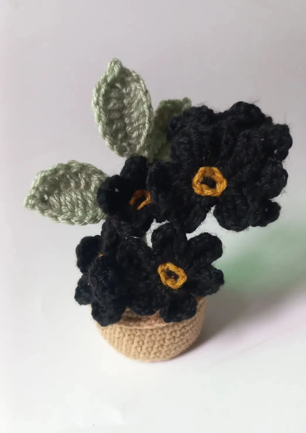 Experience the beauty of these handmade crochet forget me not pots. The black color adds a touch of sophistication to any room. Its small size makes it perfect for any space. Bring a piece of nature into your home with our Forget Me Not Pot!