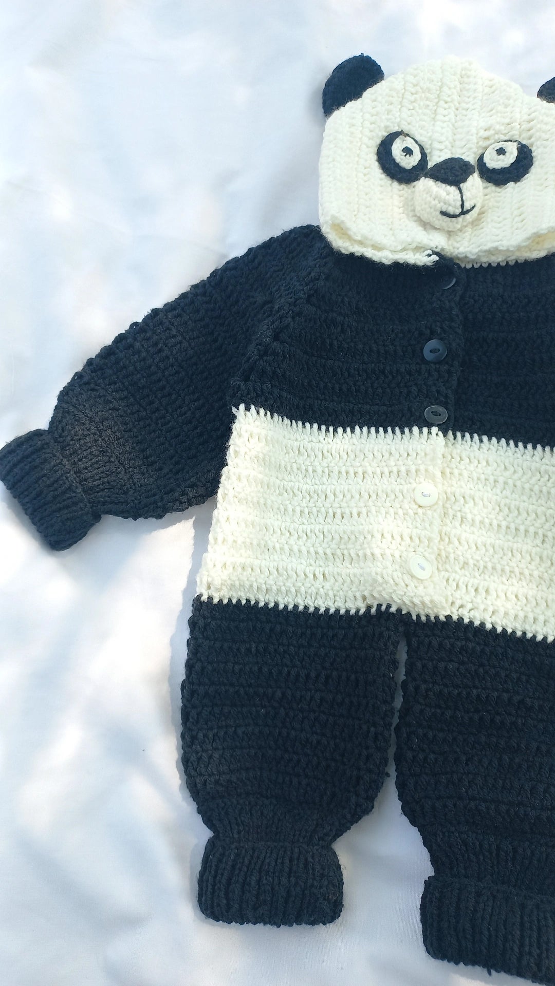 Bringing you adorable Crochet Panda Romper for babies! Crafted from soft, warm yarn, this romper is perfect for keeping your little one cosy and stylish. The design features an angry panda face on the hood, adding a playful and unique character touch. With its plush texture and snug fit, this romper is not only cute but also comfortable for your baby to wear all day long. Ideal for photoshoots, playtime, or as a special gift, this panda romper will make your little one the centre of attention.