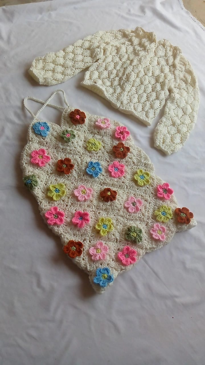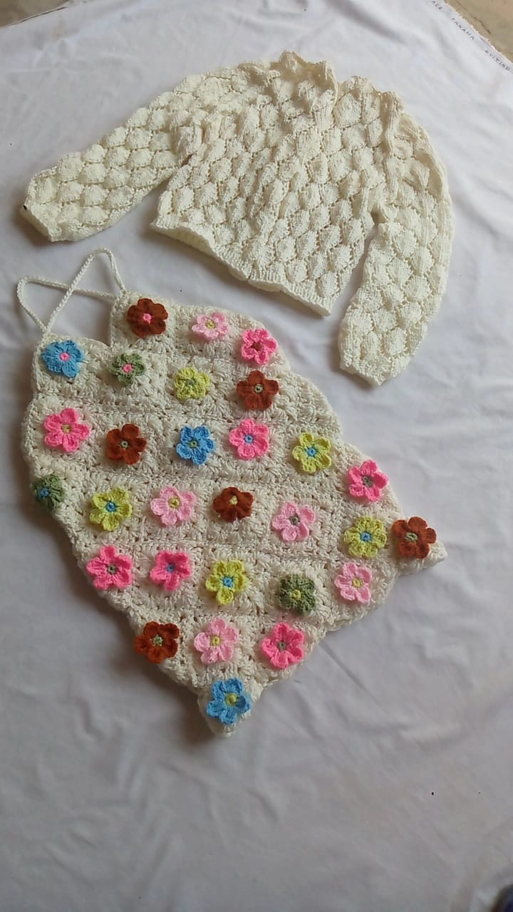 "Our beautifully designed kids' set features a finely knitted cardigan paired with a crocheted floral top, crafted to perfection. The cardigan offers a soft, cosy feel, ensuring warmth and comfort for your child, while the top is delicately crocheted, adding a charming, handmade touch to the ensemble. Both pieces are thoughtfully made with attention to detail, combining style and comfort. Ideal for layering during cooler days, this floral top and cardigan set brings together a delightful mix of elegance and warmth, perfect for your little one’s wardrobe."