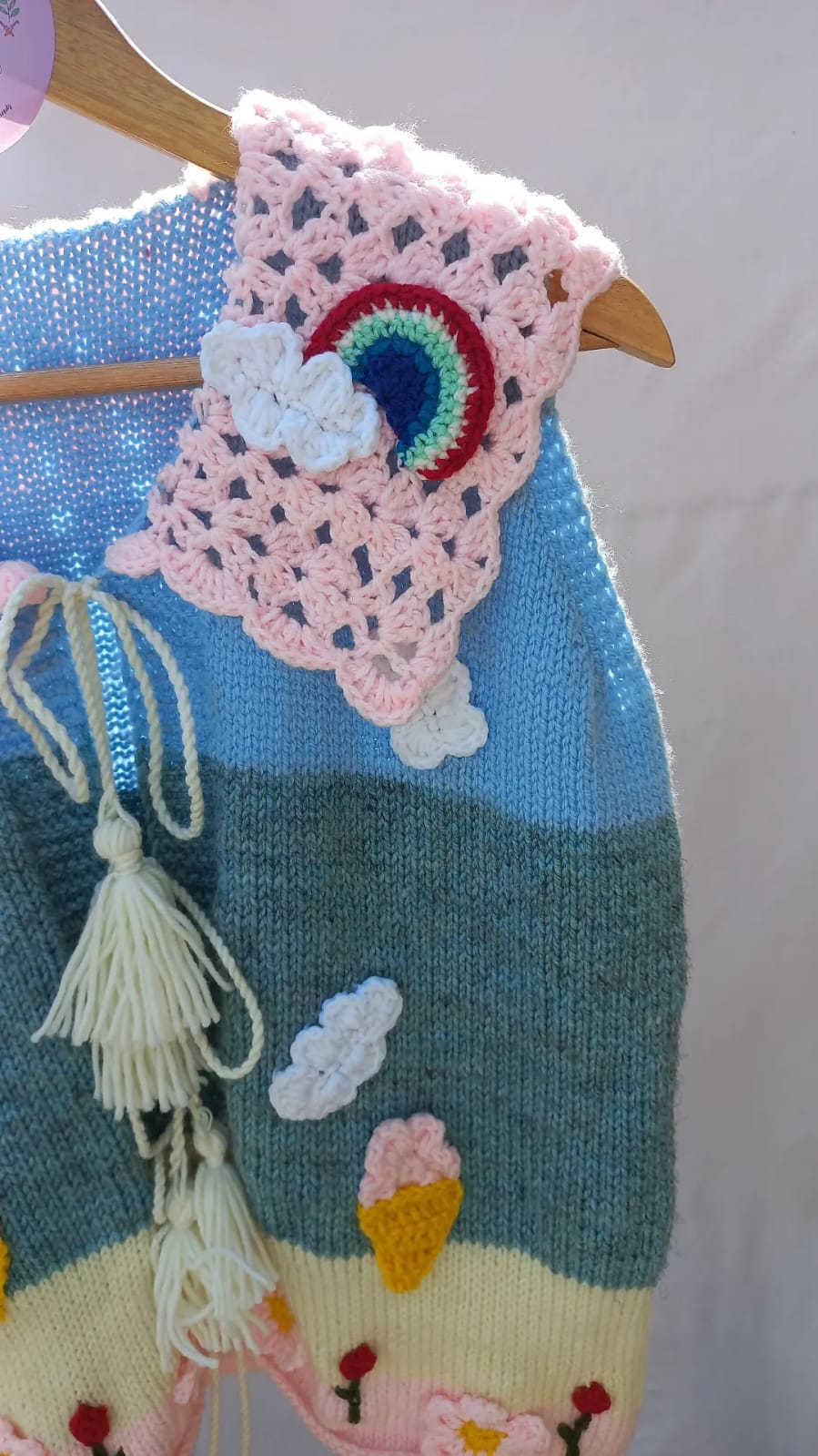 "Make a bold statement with our handcrafted knitted vest, a celebration of texture, colour, and creativity! Adorned with intricately designed appliques and playful tassels, this unique piece is the perfect blend of artistry and comfort. Each applique tells a story, and the flowing tassels add movement and charm to your outfit. Whether paired with jeans for a casual look or layered over a dress for a boho-chic vibe, this vest is sure to turn heads. Lovingly crafted to make you stand out while supporting a cause — 40% of profits go towards animal rescue efforts. Wear it, love it, and make a difference!"