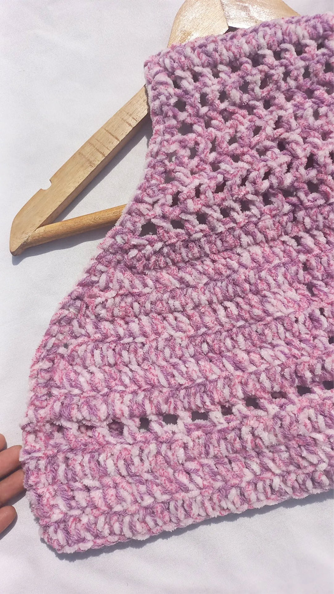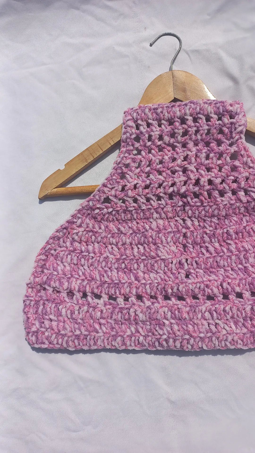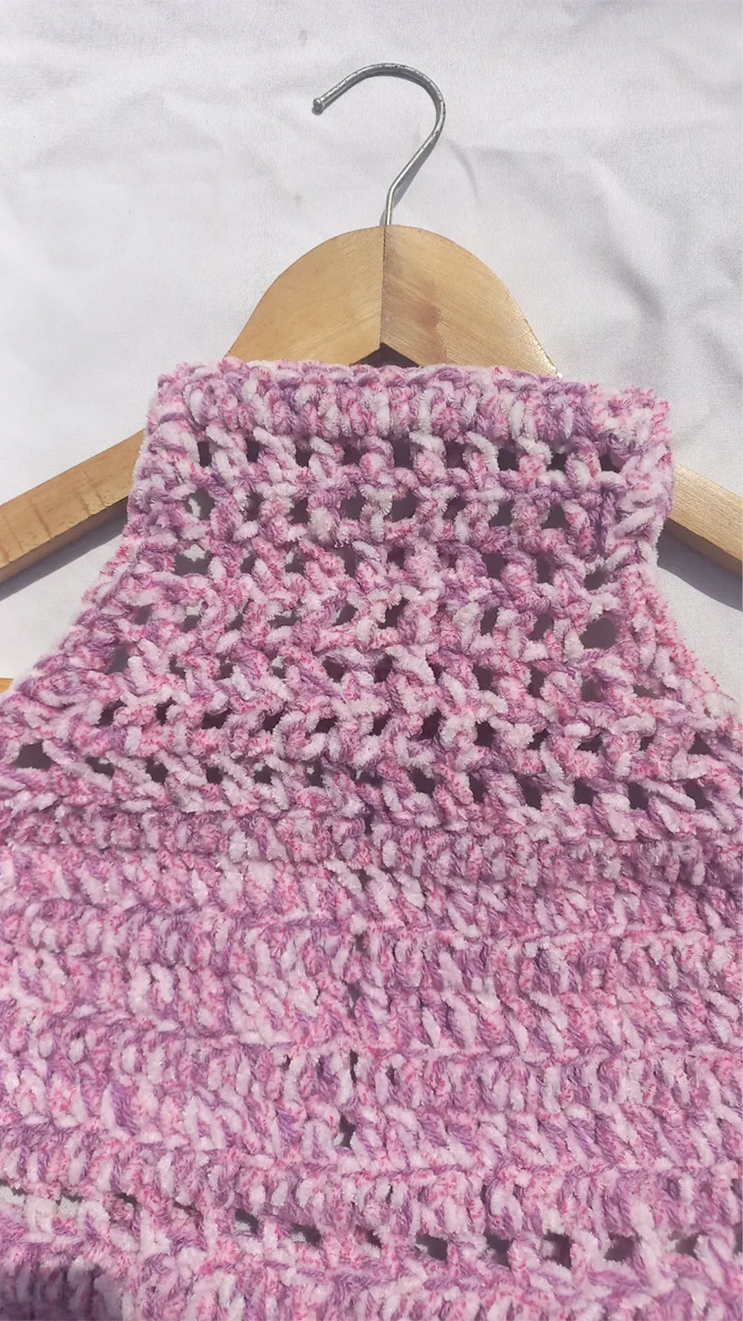 Enhance your wardrobe with our luxurious velvet halter top. This modern-cut top is hand-crocheted with a trendy twist, combining delicate crochet with soft, plush velvet. A timeless piece that exudes confidence and style.